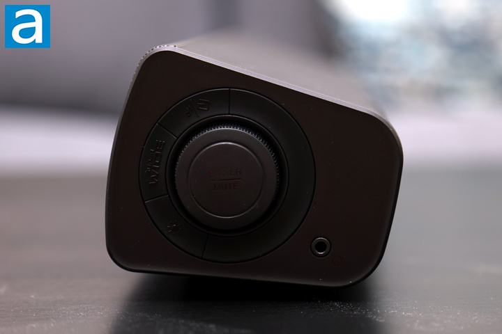 Flipping to the right side, we can see all the user buttons to make changes with the Creative Sound Blaster GS3. In the middle, we have a large knob that has multiple functions. To power on or off the sound bar, you can press this knob for a couple of seconds until the front LED flashes. While it is on, pressing the button will also toggle muting. The knob then spins so you can change the volume. When you are connected to your computer over USB or Bluetooth, this will change the device's volume. When connected with the 3.5mm audio connection, this volume will act independently of the source. There are three more buttons around the knob. At the top, we have a button to cycle between the inputs. Also, this acts as the Bluetooth pairing button when the Bluetooth input is selected. Next, we have a button that is labeled SuperWide. This enables a virtual effect to make the sound wider and create a larger soundstage than normal. At the bottom, we have a button for the RGB under glow lighting. This cycles through multiple effects.