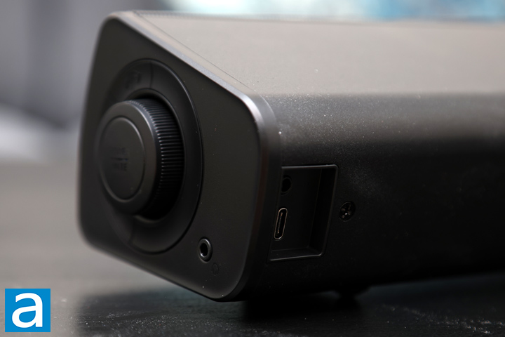 As for the connections, there are a few to mention. Behind the knob, but still on the side of the Creative Sound Blaster GS3, there is a 3.5mm connection for you to plug your headphones in. Once you do so, the sound will be directed to your headphones rather than through the drivers. At the back, there is a USB Type-C input, which lets you power and connect your PC or other devices for sound output. Above this is an AUX input to connect to devices that might not have a USB Type-C connection. This is important, given the only cable included is USB Type-C to Type-C.
