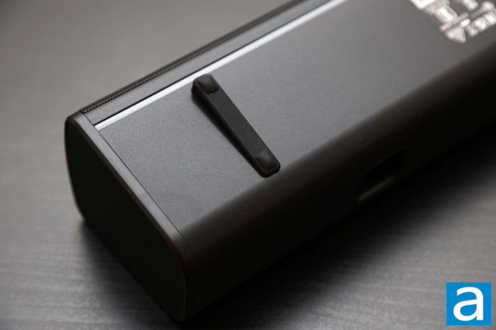 From the bottom, we have two wedged feet that direct the Creative Sound Blaster GS3 a bit higher. Given this is going to sit under a monitor, this inclined bottom makes a lot of sense. The wedged feet are made of rubber and work well in ensuring the soundbar does not move on its own. Something that is hidden on the back of the Sound Blaster GS3 is the port hole. This allows air to escape out of the back, which should allow for a better lower frequency. Finally, there is a thin translucent bar in front of the rubber wedge. This is a diffuser for the RGB LED lighting that glows out. There are several presets of lighting effects, such as an aurora glow or an audio reactive pattern, but you can also turn it off if you do not want the glow.