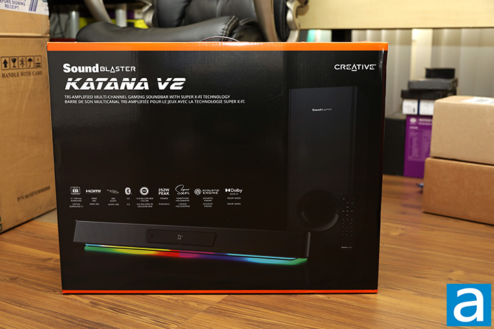 Creative sent us a retail package of the Sound Blaster Katana V2 for our review today. The large retail box could have easily doubled as a shipping box by itself, which features a carrying handle at the top to make carrying a little easier. The box art consists of a primarily black background with orange highlights on the side. Prominently shown is the soundbar itself with a RGB LED underglow lighting activated, followed by a photo of the included subwoofer and remote control behind. The Sound Blaster and Katana V2 branding can be found at the top left corner, followed by the product description of "Tri-Amplified Multi-Channel Gaming Soundbar with Super X-Fi Technology". An array of icons for highlighting the soundbar's 5.1 virtual surround, HDMI ARC, USB audio, Bluetooth 5.0, 16.8 million color RGB LEDs, Super X-Fi headphone holography, Acoustic Engine, and Dolby Audio is just below the middle. A diagram with more feature highlights can be found at the back, with specifications and a content list on the sides of the box.