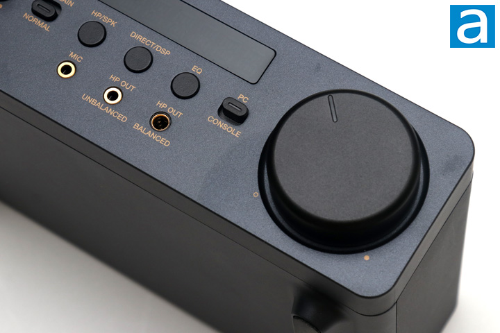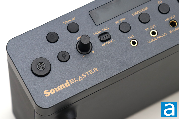 Underneath, we have two controls for the microphone. The single button is used for microphone mute, which is pretty straightforward. The knob on this side changes the microphone gain level. This is a centralized knob for microphones, as it works for both the front input and if you plug a USB one at the back. If you turn the gain to zero or mute the microphone, the mute button will glow red. Subsequently, pressing the button again or changing the gain knob will unmute the microphone. Finally, there is a switch to toggle the headphone gain to help power higher impedance headphones. This high-gain mode is meant for planar-magnetic headphones or ones with an impedance of greater than 150Ω. According to Creative, the headphone amplifier in here can support headphone impedances of 16 to 600Ω, which is quite the range.