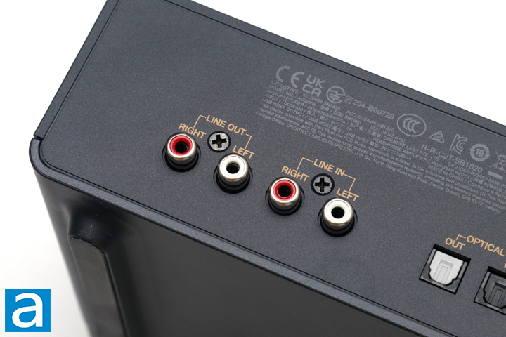 Moving to the back, we have a large list of certifications and regulatory information. Otherwise, the main thing to look at here is the set of connections. From the left, we have two RCA connection pairs for output and input. An RCA-to-3.5mm audio cable is included in the box to be used here if you are so interested. Finally, at the bottom, you can see a protruding leg on one side with rubber lining the bottom. There is another bar on the other side and these rubber feet really keep the Creative Sound Blaster X5 in place without easily moving about.