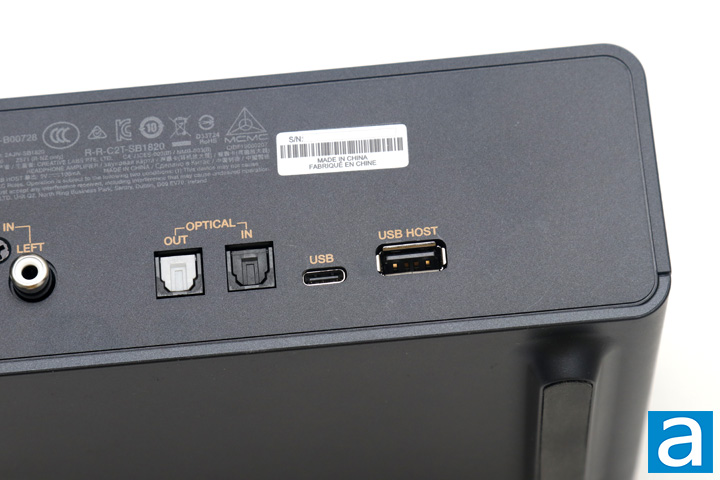 On the right side, you can see a pair of TOSLINK optical ports for input and output. Next up, we have a USB Type-C port for powering the sound card and connecting the Creative Sound Blaster X5 to your computer or to a console. Creative says you can connect this external sound card to Windows and MacOS devices, as well as the Sony PlayStation 4 and PlayStation 5. You can also just connect the box to a USB AC adapter and use the other input connections at the back for the audio source. Finally, the last connection here is a USB Type-A port, which is used as a host audio streaming port. This lets users connect devices like USB headsets, microphones, speakers, or a Bluetooth audio transmitter, if you so desire. One should note this port is limited to 5V 100mA, so any device requiring more power will need to look elsewhere.