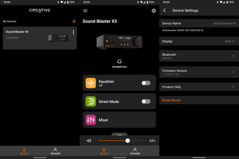 The app may not be as full-fledged as its desktop counterpart, but it does allow for quick changes to necessary functions. From the main page, you can see the ability to connect to multiple Creative devices. Inside the Sound Blaster X5 menu, three settings are included, which are Equalizer, Direct Mode, and Mixer. These align with the same setting pages on the desktop utility, so I will not go into more detail here. Finally, under Settings, you can see the Bluetooth devices connected as well as an option to update the firmware of the Sound Blaster X5.