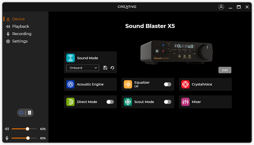 After installing the utility and updating the firmware and drivers, this is the first page. From this main page, you can see all of the features that can be changed with the Sound Blaster X5. Everything here is laid out nicely with different color icons to easily differentiate between the options. There are also a set of four tabs on the side, along with sliders near the bottom to change the volume for the output and input.