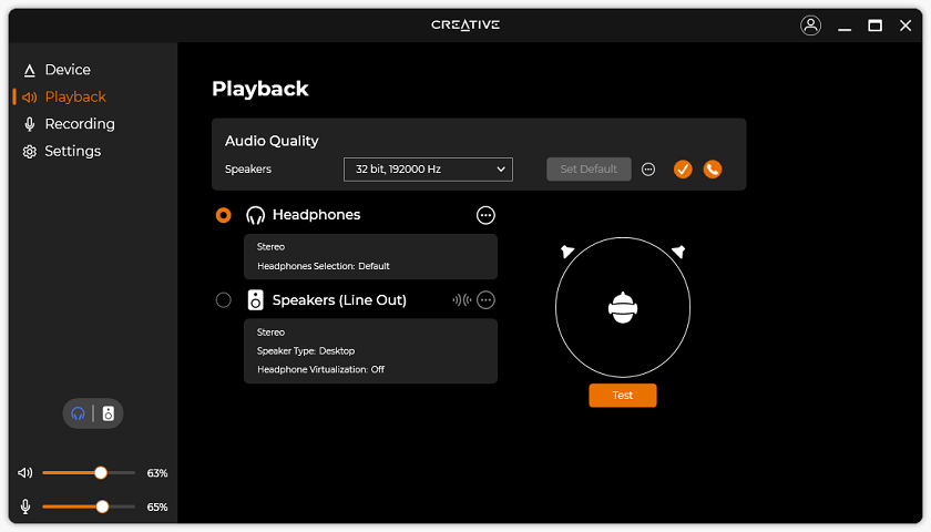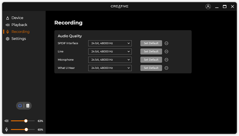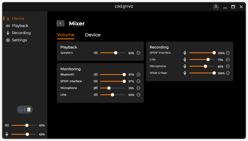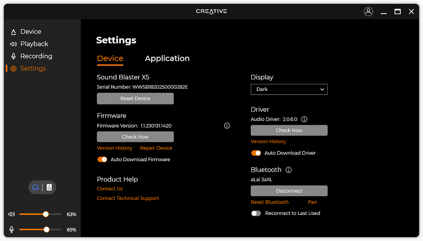Down the side, you can see three more pages. First is Playback, where you can change the audio output bit depth and sample rate. From here, you can even select the specific headphones you are using to apply device-specific equalizer settings, assuming it is listed in the Creative app. Unfortunately, the app did not know of my Sony MDR-7506 or my Philips SPH9600, but there are quite a few other models here. Under speakers, you can change the type of speakers and enable headphone virtualization if you so desire. Moving to Recording, users here can set the bit depth and sample rate for each of the inputs. Finally, under Settings is where you can update the firmware, driver, and application. You can also view the connected Bluetooth devices and change the UI display colors.
