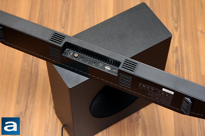 A slim subwoofer is included to fill in the lower frequencies otherwise not reached by the quad drivers located on the soundbar itself. The subwoofer has dimensions of 333mm by 130mm by 299mm and weighs in at 8.8 lbs, which houses one 5.25″ driver inside. The long-throw driver features a "super stiff" paper cone and low loss surround. The enclosure cabinet is made out of MDF with a flared port tube.
