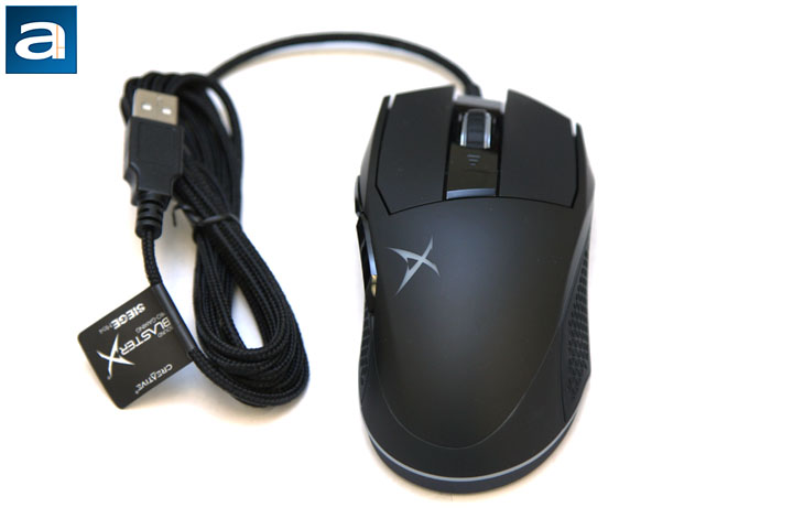 In the review of the Creative Sound BlasterX Vanguard K08, Aaron pointed out all the corners of the keyboard were cut off, leaving zero ninety degree corners on the edges. The design of the Siege M04 is consistent with the Vanguard K08. There are no ninety degree corners on the mouse. The front of the mouse is shaped like a spearhead, which is a nice gaming product feature. The color of the mouse is black. In my personal opinion, black is the best color if you want to emphasize your shining RGB lighting effects. Yes, this time we have RGB. From the above picture, we can see the RGB lighting is around the edge of the bottom of the mouse, and a little slope is there to help the lower level RGB to be more observable. In this photo, you can only see a little bit of the RGB strip at the back of the mouse. Later, we will see what the RGB looks like when plugged in. The "X" logo that represents the "Sound BlasterX" is located at the middle left of the mouse. Right now, the logo is not illuminated. It will shine when the mouse is plugged in.