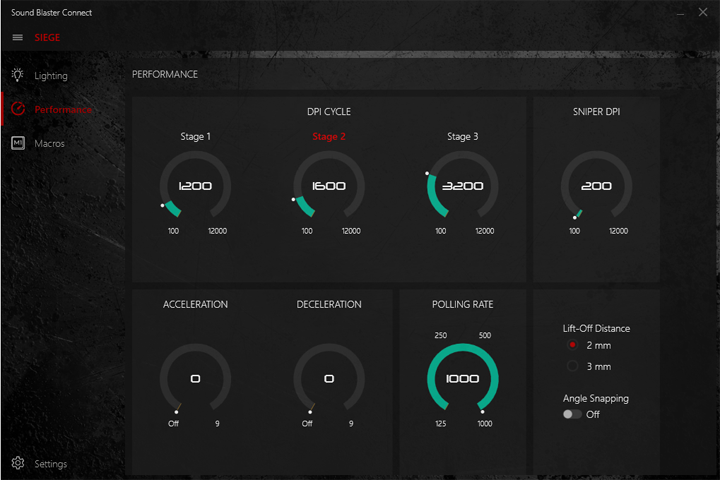 Remember we have the backlit DPI indicator bars in the middle of the left and right buttons? There are three bars associated with three DPI settings. The three-level DPI cycle button provides on-the-fly DPI switching. Of course, the DPI value of each level can be set in the GUI. Once all the settings are stored in the built-in memory of the mouse, users can switch among the three settings of DPI on-the-fly by pressing the DPI cycle button. Other important features such as lighting, macros, acceleration and deceleration, polling rate, lift-off distance, and the angle snapping can all be programmed in the GUI. Generally speaking, the provided software is reasonably powerful. You can basically customize everything on your mouse.