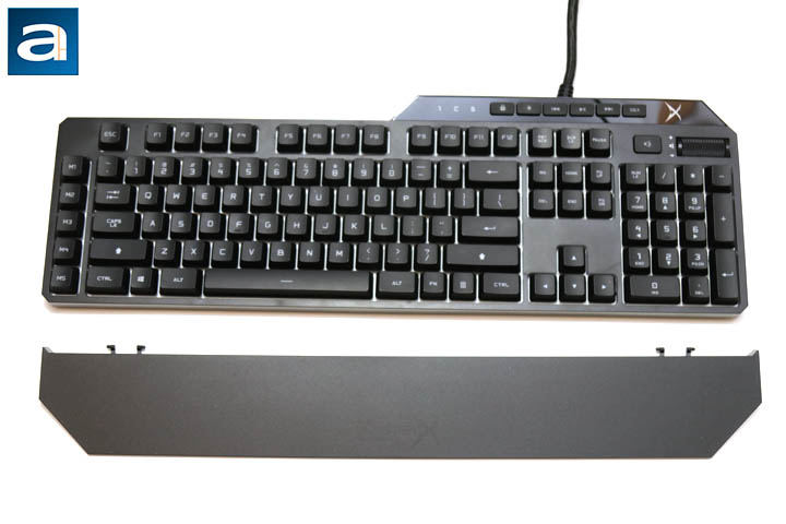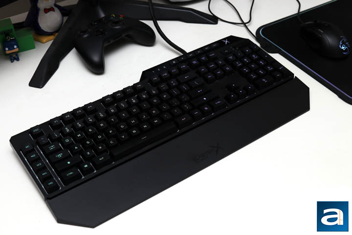 For Creative's first dive into the gaming peripheral market, I have to say they made some pretty interesting choices in their Sound BlasterX Vanguard K08. While a lot of the market is going to minimalism in terms of design, the Vanguard K08 takes a much more gaming approach, albeit a conservative one. From here you can see all of the angles are cut off, resulting in zero ninety degree corners on the edges of the keyboard. Creative has also kept branding at a minimum, with just the Sound Blaster "X" at the top right corner and the full logo subtly printed in the middle of the wrist rest. The K08 name can be found on the left and right side of the frame, but it is relatively hidden. The frame around the edges is quite thick also, but it is not too bad. The whole design is made out of plastic, with a slightly gritty finish on the edges. The top bar and side trimmings all are glossy in finish, for better or for worse. All of the surfaces pick up fingerprints easily, especially the keycaps, though I will get into those later. It is obvious the design is definitely targeted at the gamer crowd, but I think it is clean enough to be appreciated by non-gamers too.
