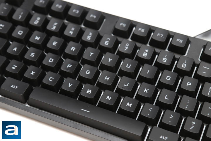 The Creative Sound BlasterX Vanguard K08 came to us in a standard 104-key QWERTY ANSI layout. As such, most of the keyboard is laid out in the same way as every other keyboard sent to APH Networks. The keycaps are average in quality, with the letters being translucent to allow the backlighting through. These are laser-etched ABS keycaps. ABS, which is short for acrylonitrile butadiene styrene, is a commonly used plastic for keycaps. They offer decent quality, but are also seen as inferior compared to PBT, or polybutylene terephthalate, which are stiffer, harder, and keep their color better. Thus, fingerprint staining will be seen with these keycaps. Maybe I have been spoiled with PBT keycaps, but I am a bit disappointed with the quality of these keycaps. It does not shine as quickly as some ABS keycaps, but oily marks do appear easily. To round off, font of the lettering on the keys is clean and legible. The surface of the keycaps is pretty smooth, but it feels nice on the fingers.