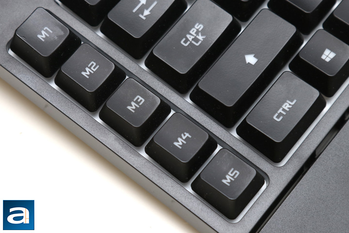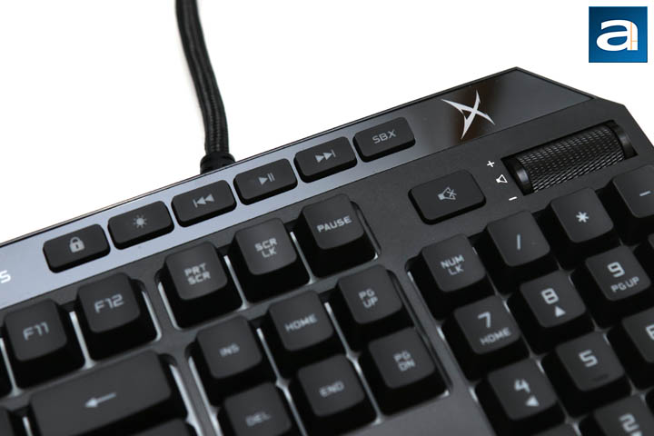 There are two more areas on the Creative Sound BlasterX Vanguard K08 to point out. The first exists on the far left where the dedicated macro keys are located. Using the software Creative has included with the Vanguard K08, you can record and save macros to these five dedicated macro keys, as well as any other key if you so desire. We will see how the macro recording and assigning process goes when we take an overview of the software later on. There are actually no other secondary keys on the keyboard. Instead, all of the keys you would normally find are located on the top right corner. This includes the Windows Lock key, a Brightness toggle, Previous, Play/Pause, Next, and a key marked SBX. Apparently, this last key is meant to launch the software, though I was unable to make this work properly during my use. These keys are all membrane keys, but they feel pretty decent to press. A Mute switch and Volume wheel round out the rest of the functions on the right side. I should note all of these keys are backlit, though they are set to specific colors. The keys on the top bar are all white, while the Mute key is illuminated red. The backlight of the Windows Lock and the Mute buttons will start flashing when their respective functions are active.