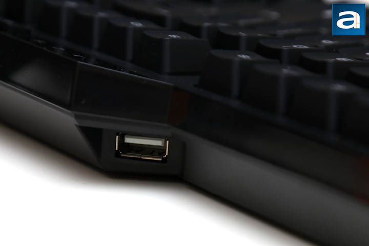 At the back, we have two things to point out, despite only showing one thing in the photo. First, we have the USB 2.0 output port. This port allows for both power and data transfer through your computer. While I would have liked to see something faster than USB 2.0, not many other keyboards have anything better here. It should be noted the port is angled in a forty-five degree angle away from the keyboard, which may make plugging and unplugging devices without looking a bit of a hassle. The second part to point out is the thick braided cable, protruding out the right side of the keyboard. This cable measures about 1.8 meters in length, and is surprisingly stiff. This is pretty typical for such a thick braided cable, but I would like to see a bit more flex. Otherwise, the cable splits off at the end into two USB plugs, with one to connect the keyboard and one for the extra USB port.