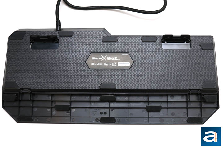 The last place to inspect the Creative Sound BlasterX Vanguard K08 is the underside of the keyboard. This bottom area is lined with a triangle pattern for a neat effect. The bottom is lined with not four, but eight rubber hexagons to keep the keyboard from unintentionally moving. Two large flip feet kick out at the back if you want to raise your keyboard, but they do not have any rubber ends to prevent any sliding. It would have been nice to see some grip on the feet, but it is not a huge deal. Finally, you can see there are another eight more rubber grips on the wrist rest too.