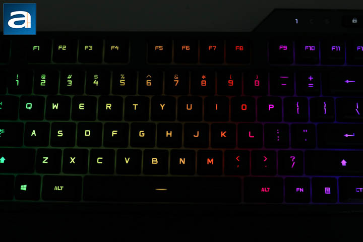 With the keyboard plugged in, we can now turn our attention to Creative's Aurora lighting on the Sound BlasterX Vanguard K08. As you can tell by the name, the lighting is RGB and looks amazingly vibrant. With the LEDs located directly underneath the keycap, the lights shine right though. Even better is the fact this lights up the whole key very well. On larger keys with words that spread across the key, such as "Caps Lk", there is a bit of fading on the sides, but it still looks evenly lit. Furthermore, the accuracy of the colors on the keyboard is surprisingly well done. Even the white backlighting looks neutral, with neither a blue nor yellow tint. One subtle thing I like is the fact they let the "X" logo follow the same lighting pattern as the rest of the keyboard, making for a very neat effect.