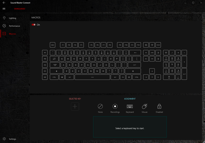With the Sound Blaster Connect utility installed, you can see there are three main tabs, as listed on the side. The first is Lighting, and all the available options have already been mentioned. A preview of the keyboard is visible to show users what they can expect for lighting. The next tab is the Performance tab, where you can change the repeat delay, repeat rate, and polling rate. Finally, the Macros tab is where you can setup macros for practically every key. This macro can be produced from keyboard actions, mice actions, or a recorded combination of actions. Overall, the software is decent, but there are some parts I think could be improved upon. For one, the software has an overall lag in using it, especially when changing colors. I think this comes from the fact it is continuously automatically updating the keyboard with every change you make, causing for a sluggish feel. This could be changed by removing this automatic polling and adding an Apply or OK button at the bottom to confirm changes. Secondly, there are several user interface issues I ran into, including the scaling of the entire application. For example, you can get into a window size where one tab will show all of the interface elements on the page, but with the same window size, another tab will have options cut off. At the end of the day, there are several areas I would like to see polished here, and hopefully we will see updates from Creative in this regard.