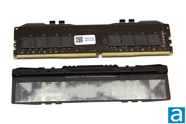 As you can see more clearly in our photo above, the Crucial Ballistix DDR4-3600 has a very nice black PCB. The heatspreader is composed of two separate pieces; one for each side. The two sides are held on to the module itself by strips of thermally conductive adhesive and are interlocked together at the top for alignment. The adhesive force between the two heatspreaders and memory ICs is pretty strong, so if you ever do take them off, keep your hair dryer around.