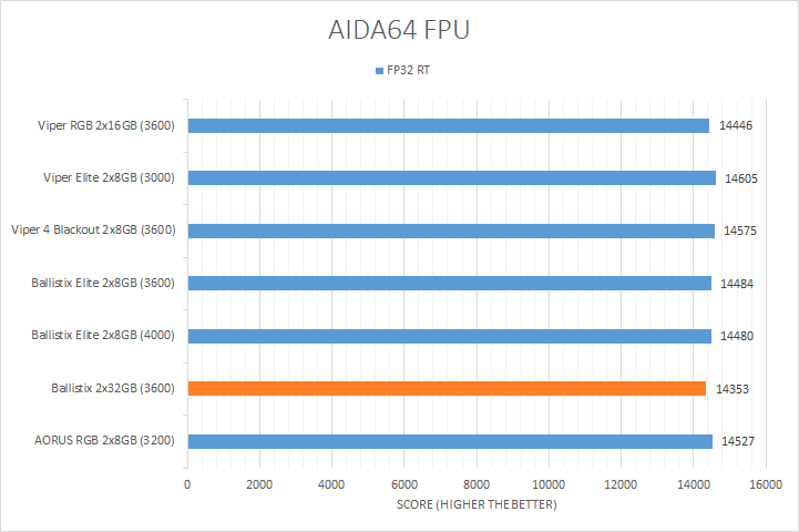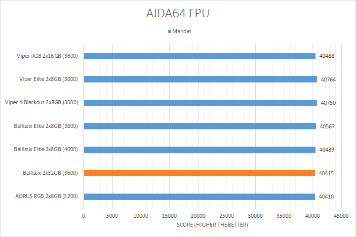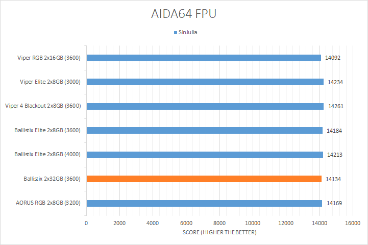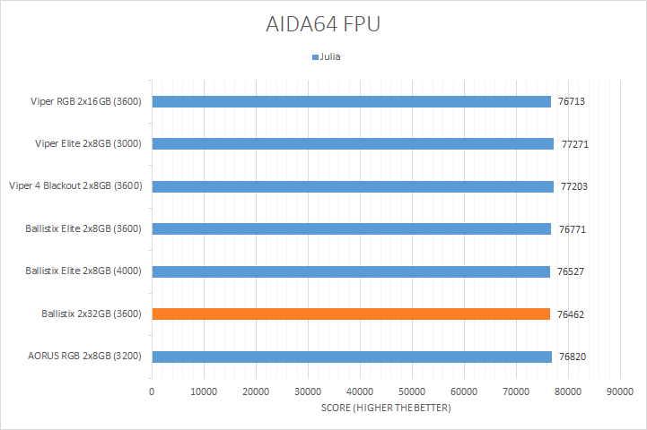 Usually, AIDA64's FPU benchmarks are the least exciting of all when writing a RAM review. This is because the way results are obtained is usually highly dependent on the tested processor; so much to an extent that the outcome is virtually irrelevant to the speed or latencies of the installed memory modules. As you can see in our graphs above, all the results were within a few percent of each other. In the case of Crucial's Ballistix DDR4-3600 2x32GB dual channel kit, it scored mostly near the back for almost everything. At the end of the day, they were all within the same ballpark as each other.