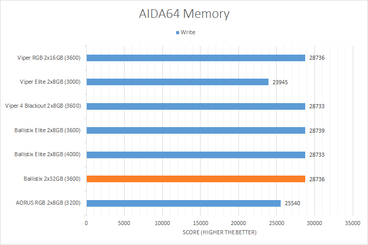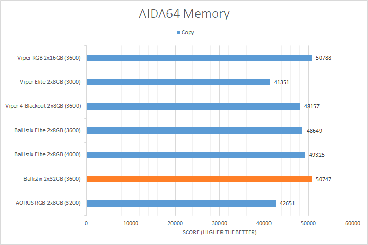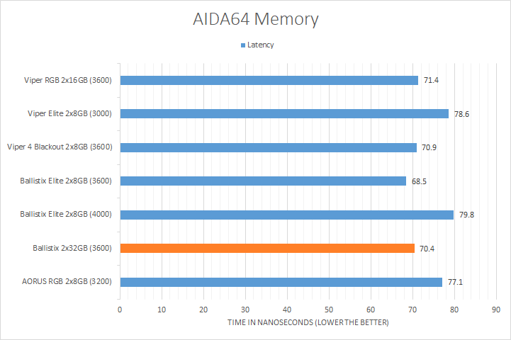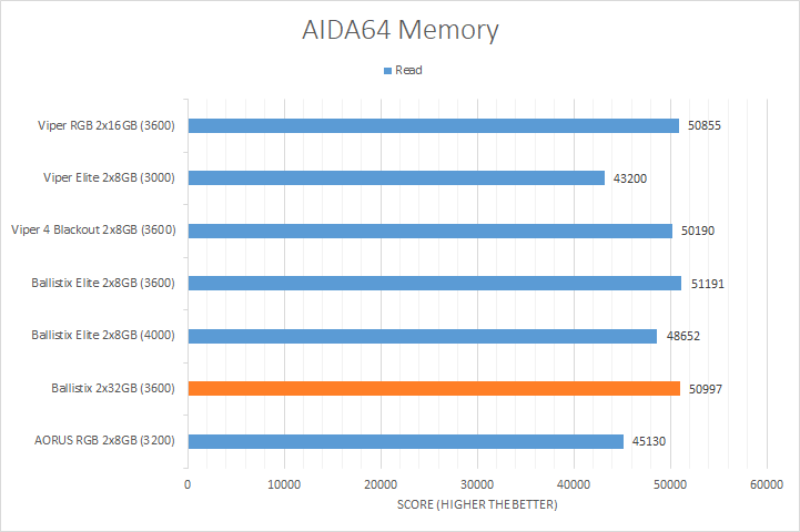 AIDA64's synthetic memory tests are the one next up to produce results for our review today. Traditionally, in pretty much all the benchmarks, see higher memory bandwidth RAM kits are generally favored, whether it is the Copy, Write, or Read results. Operating at DDR4-3600, the Crucial Ballistix 2x32GB came in at the top or near the top for all tests, which is not surprising given its rated bandwidth.