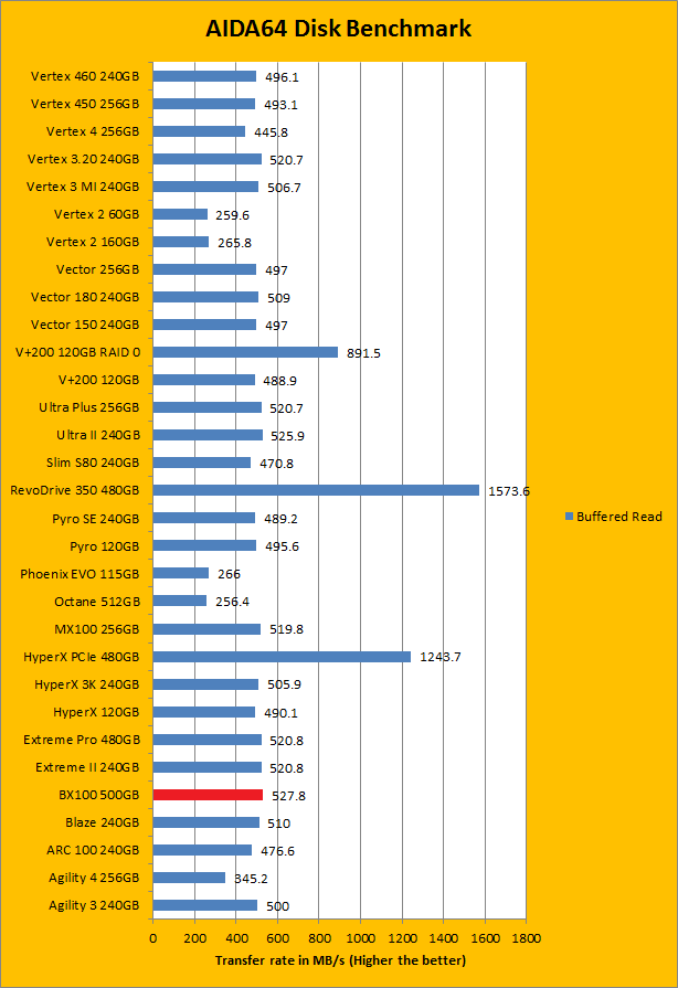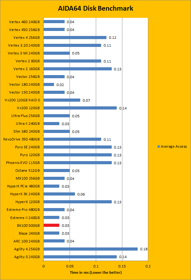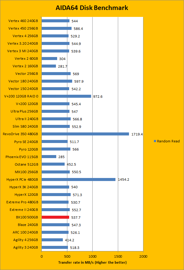 Since our SSD review benchmark results are presented in alphabetical order, first up on the list are results from one of our favorite benchmarking programs, AIDA64 Engineer. Just to note, AIDA64 Engineer is a full synthetic benchmark. Unlike full synthetic motor oil, this usually does not always carry a good connotation. While it is not a representation of real life performance (Such as how fast Photoshop opens), it does provide valuable insight into performance between different drives and different controllers. As you can see in our graphs above, the Crucial BX100 500GB is very similar to the MX100, despite based on an entirely different controller. Compared to other value oriented drives in the category, there is not much that differentiates them in AIDA64. The tested random access time was 0.03ms, which is among the lowest. The rest of the comparison results against all the other drives can be seen in our graphs above.