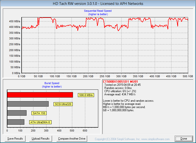 After giving the Crucial BX100 500GB a clean format and ensuring alignment and everything is correct, I fired it up for some testing in HD Tach. While HD Tach is more of a 'drag race' than a clear indication of real life performance, and has been around for a really long time, it is an excellent storage performance reference among SSDs with the same controller, and has been our favorite benchmark long before hard drives even cracked the 50MB/s mark. With an average read speed of 434.7MB/s according to HD Tach in single disk configuration, this is the one of the best results we have seen here at APH Networks (The SanDisk Ultra II 240GB is still the highest scoring at 469.3MB/s). For most solid state drives, we typically look for something that is faster than 350MB/s. From our experience, most drives do not crack the 400MB/s line. At the end of the day, HD Tach may not be the best test for solid state drives all the time, but we really cannot argue against the results.