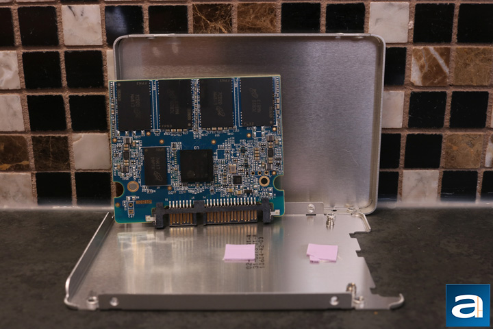 The casing is quite easy to remove. There are two screws on each side. After removing them, the casing easily comes off. The actual hardware inside is quite a bit smaller than the metal housing. As you can see I accidentally broke one of the thermal pads when I removed it from the circuit board. The 3D MLC NAND inside should be able to give us consistent performance, power efficiency, and good capacity for the price. Both the sequential read and writes are rated to go over 500MB/s, while the random read is 84K IOPS and the random write is 90K IOPS. The drive also has a couple of nice features included to give it a boost in experience. These features include multistep data integrity algorithm, thermal monitoring, SLC write acceleration, active garbage collecting, TRIM support, error correcting code (ECC), and device sleep extreme low power mode (DEVSLP). The controller the BX300 uses is the Silicon Motion SM2258, while the memory is Micron's DDR3 DRAM. All of these features should work together nicely for a decent performing drive.