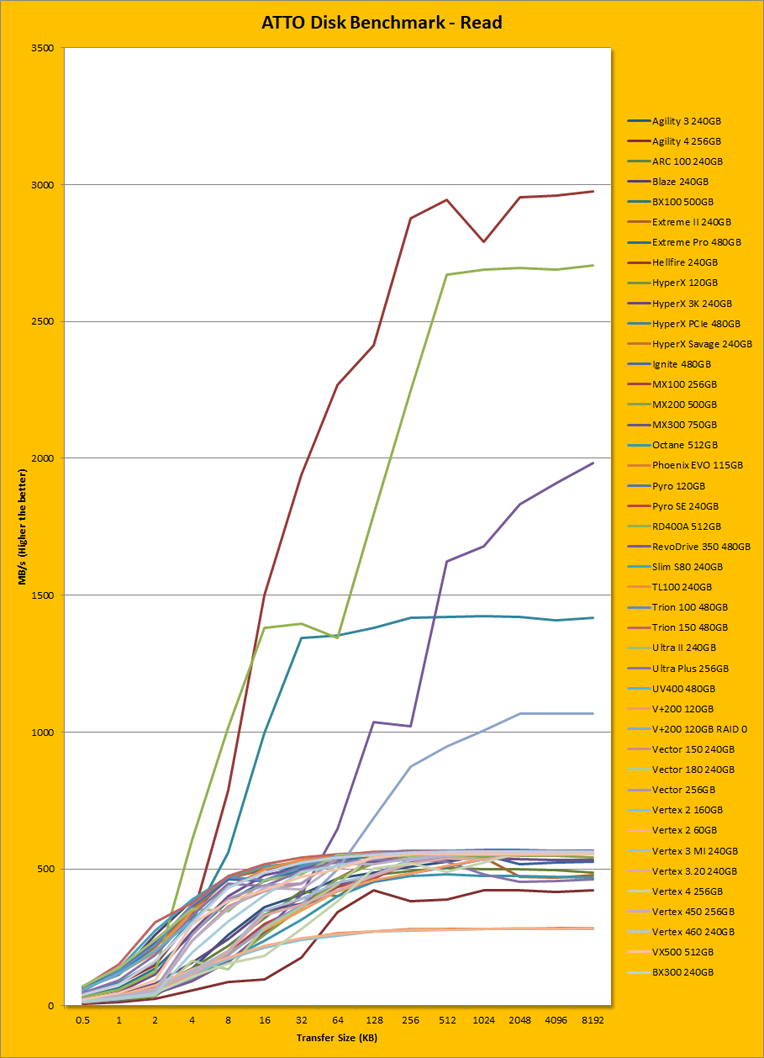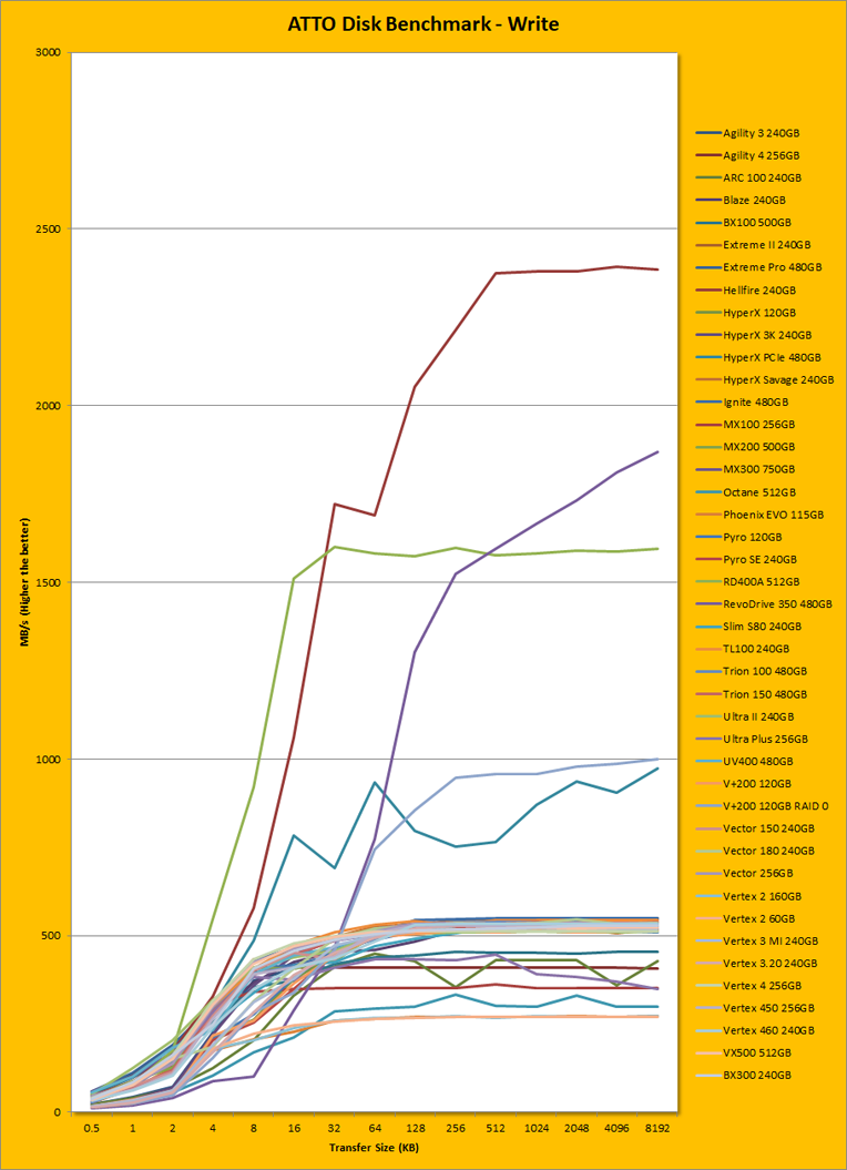 Next is our usual ATTO read and write tests. ATTO is an often quoted benchmark, because it is easy to use and accurate. For the most part, it is a favorite among reviewers, too. ATTO uses easily compressible data, so SandForce based SSDs and similar will perform very well here. The Crucial BX300 240GB again performed similarly to majority of the drives on this list, coming somewhere in the middle where all the lines look like they converge. ATTO is the software usually used to obtain the results that are advertised. For the Crucial BX300 240GB, it was advertised to have up 510MB/s write. Some of the results actually exceeded this mark, with a maximum write speed of 528MB/s. Comparing it with the Crucial MX300 750GB, the BX300 had a slower write ramp up speed. The BX300 only reached its peak write speed at 4096KB transfer size. As for the read speeds, its advertised read speed was 555MB/s. The results met and exceeded it once again, coming in at a maximum of 563MB/s. However, the read speed did not ramp up as fast as did the MX300, which reached its peak speed at 256KB, while the BX300 only reached its top speed at 1024KB. Overall, the Crucial BX300 240GB lived up to its advertised speeds and sat comfortably in the middle of the pack.