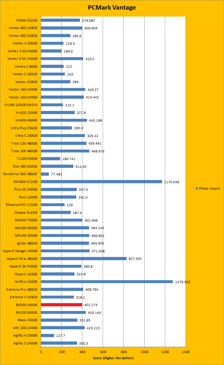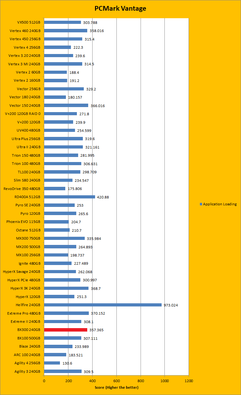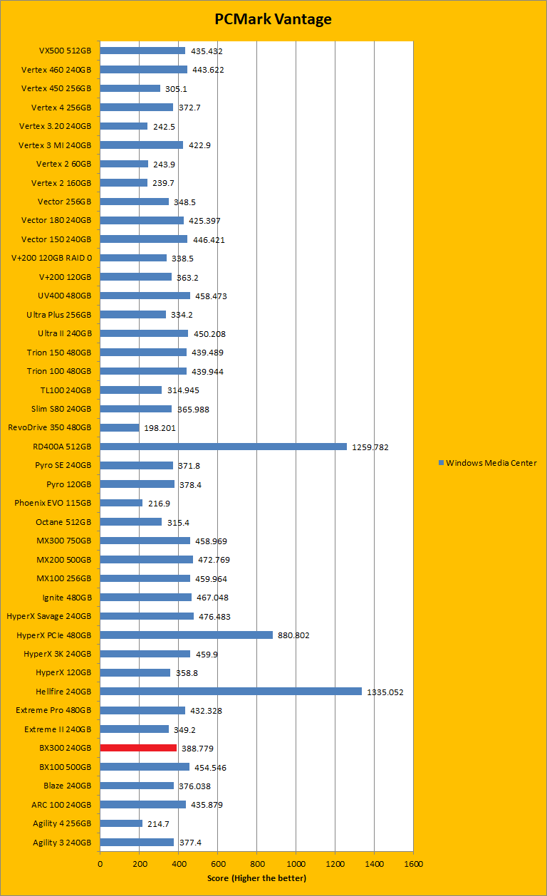 PCMark Vantage is another real-to-life performance application, albeit in a semi-synthetic means. The great thing about standardized tests is anyone can repeat them and get very similar results, given identical hardware. Overall, the results in this case of the Crucial BX300 240GB were quite good. For the most part, the results were higher or just slightly lower than other drives of the same capacity. Basically, each of the results were on the higher end of the range, with some being a bit lower. This fits quite nicely with most of the synthetic tests we ran. The overall rating sat below the Crucial BX100 500GB by quite a bit, but the BX300 was closer with the Crucial MX300 750GB. For the Windows Defender and photo import tests, the BX300 was left behind by both the BX100 and the MX300, and it was the same story for video editing. When it came to the startup test it beat out the BX100 and MX300. However, for Windows Media Center, it was again easily beaten by both the other drives. To fight back though, the BX300 beat both the other drives in application loading and the MX300 in the gaming test. Unfortunately, it lost out again in the Windows Defender test. It mostly stood up to competition, even if the differences were by small margins.