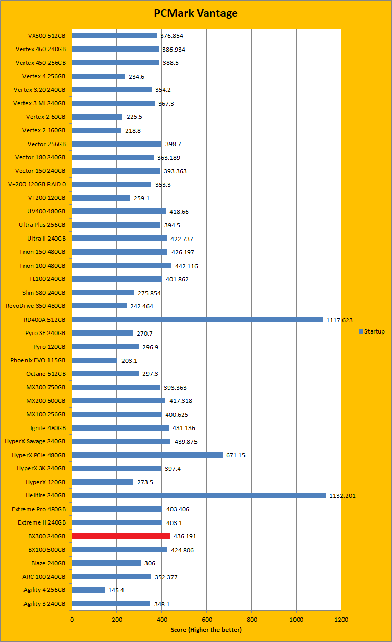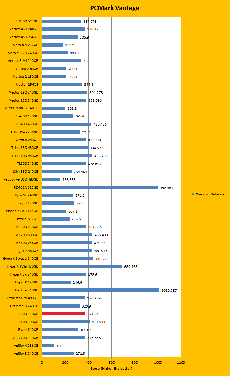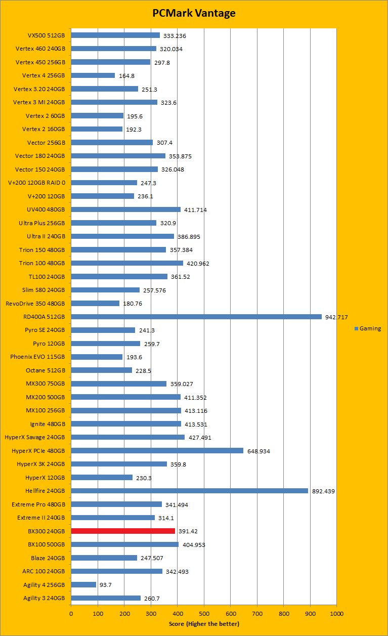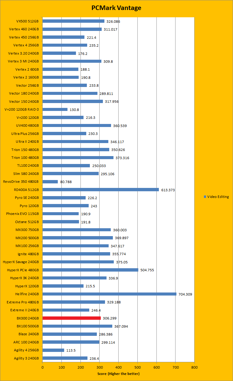 PCMark Vantage is another real-to-life performance application, albeit in a semi-synthetic means. The great thing about standardized tests is anyone can repeat them and get very similar results, given identical hardware. Overall, the results in this case of the Crucial BX300 240GB were quite good. For the most part, the results were higher or just slightly lower than other drives of the same capacity. Basically, each of the results were on the higher end of the range, with some being a bit lower. This fits quite nicely with most of the synthetic tests we ran. The overall rating sat below the Crucial BX100 500GB by quite a bit, but the BX300 was closer with the Crucial MX300 750GB. For the Windows Defender and photo import tests, the BX300 was left behind by both the BX100 and the MX300, and it was the same story for video editing. When it came to the startup test it beat out the BX100 and MX300. However, for Windows Media Center, it was again easily beaten by both the other drives. To fight back though, the BX300 beat both the other drives in application loading and the MX300 in the gaming test. Unfortunately, it lost out again in the Windows Defender test. It mostly stood up to competition, even if the differences were by small margins.