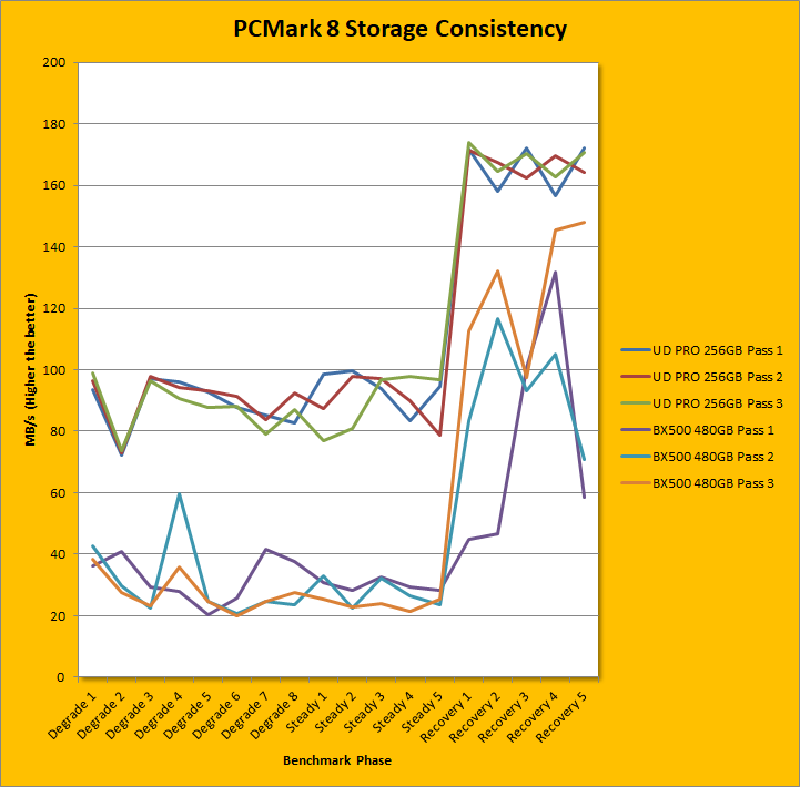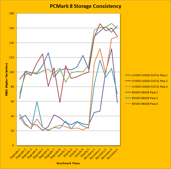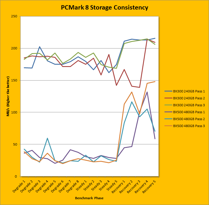 PCMark 8 Storage Consistency Test is one of our favorite benchmarks. Nowadays, many drives are well optimized for high benchmark scores when they are empty, but what separates the professional players from the amateurs is how it stands up to a truly punishing workload. PCMark 8's Storage Consistency Test is designed exactly for this purpose. Going through five phases -- precondition, degradation, steady state, recovery, and clean up -- to extend beyond real world application simulations, this benchmark takes just over two days to complete, but the results are revealing of a SSD's true capabilities. Overall, the Crucial BX500 480GB's results were straight up poor. I understand this is an ultra-budget product made for replacing your hard drive, but just look at how it compared against other ultra-budget drives. In the first chart against the BX300, the BX500 got destroyed so badly, it was not even funny. The BX500 was, on average, a whopping 83%, 73%, and 50% slower in its degradation, steady, and recovery phases, respectively, compared to its predecessor. In the second chart, where it was compared against the UV500, the BX500 was, on average, 69%, 84%, and 37% slower in its degradation, steady, and recovery phases, respectively. In the third chart, where it was compared against the Gigabyte UD PRO, the BX500 was, on average, 66%, 70%, and 41% slower in its degradation, steady, and recovery phases, respectively. The worst part was all the compared drives were in the 250GB range, while the BX500 was in the 500GB range. Higher capacity drives generally do better in this test due to the nature of this benchmark. The BX500 was simply not made for heavy workloads.