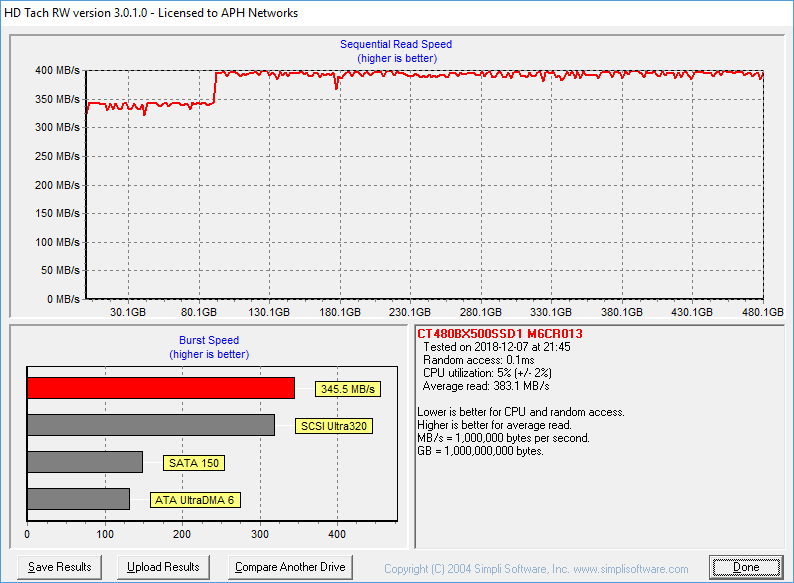 After giving the Crucial BX500 480GB a clean format and ensuring alignment and everything is correct, I fired it up for some testing in HD Tach. While HD Tach is more of a drag race than a clear indication of real life performance, and has been around for a really long time, it is an excellent storage performance reference among SSDs with the same controller and has been our favorite benchmark long before hard drives even cracked the 50MB/s mark. With an average read speed of 383.1MB/s according to HD Tach in single disk configuration, this score is not bad, but a big step back from the BX300's 475.7MB/s. For most solid state drives, we typically look for something that is faster than 350MB/s. From our experience, most drives do not crack the 400MB/s line. At the end of the day, HD Tach may not be the best test for solid state drives all the time, but these results are always interesting to look at.