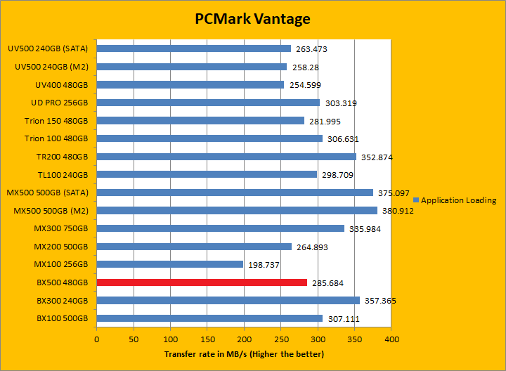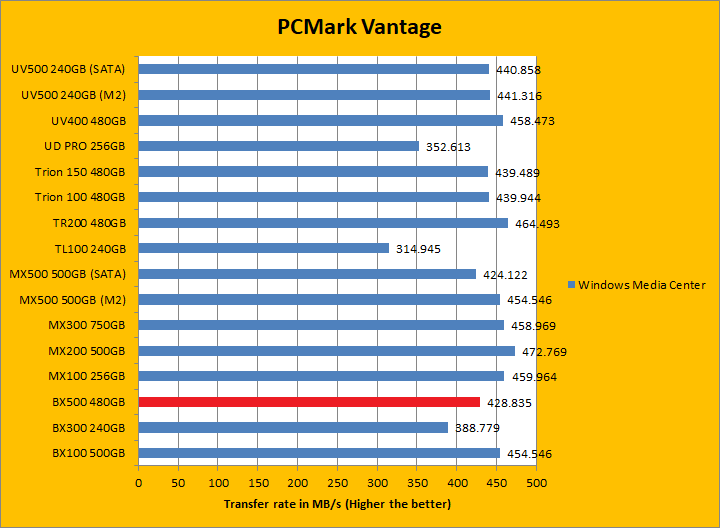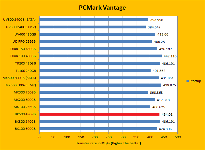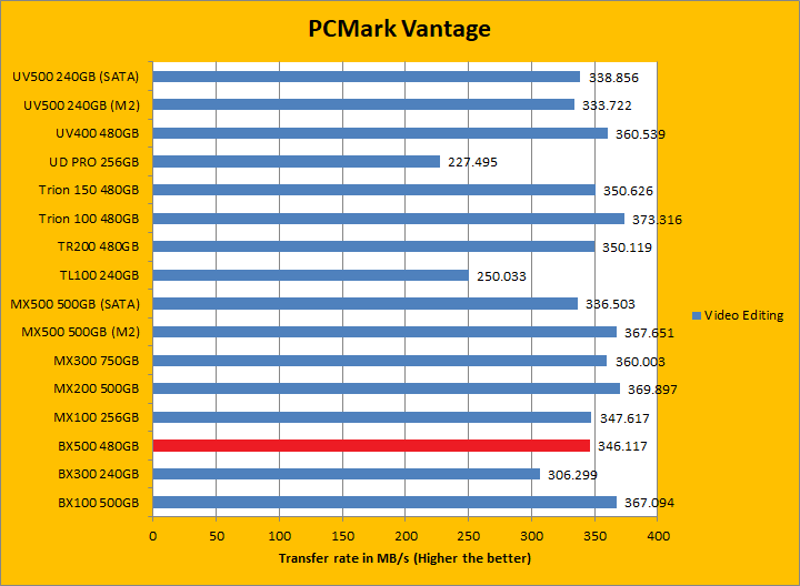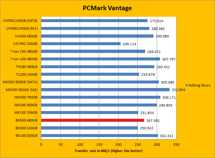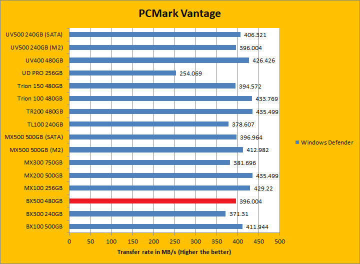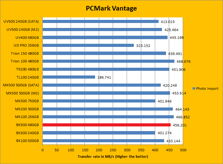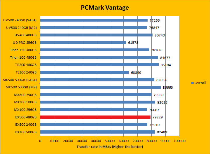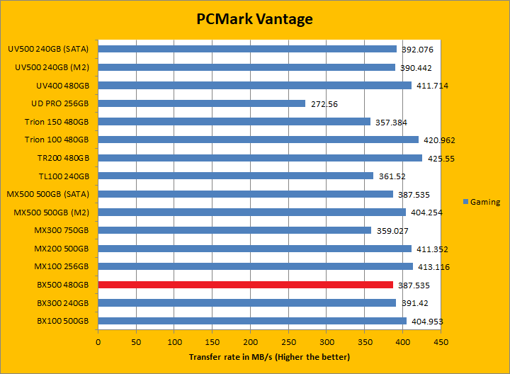 PCMark Vantage aims to shed a little more insight into real life performance of your computer hardware by semi-synthetic means -- and all insight is good, right? The great thing about standardized tests is anyone can repeat them and get very similar results, given identical hardware. Well, I am not going to narrate the stuff above in detail, because we all know graphs are there for a very good reason. Just to give you a bit of insight if you are too lazy to go through all nine comparisons, the Crucial BX500 480GB came in just a hair in front of the BX300 and Kingston UV500. It was a league ahead of the Gigabyte UD PRO 256GB. PCMark Vantage uses some pretty simple simulations, so it is pretty optimized for drives with relatively fast linear read. In the subcategories, the BX500 won five of eight tests against its predecessor and four of eight tests against the UV500. These results were, in general, pretty good.
