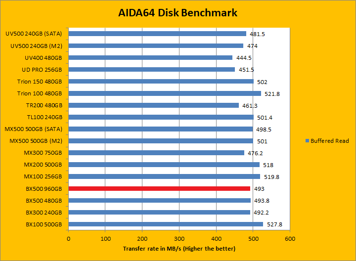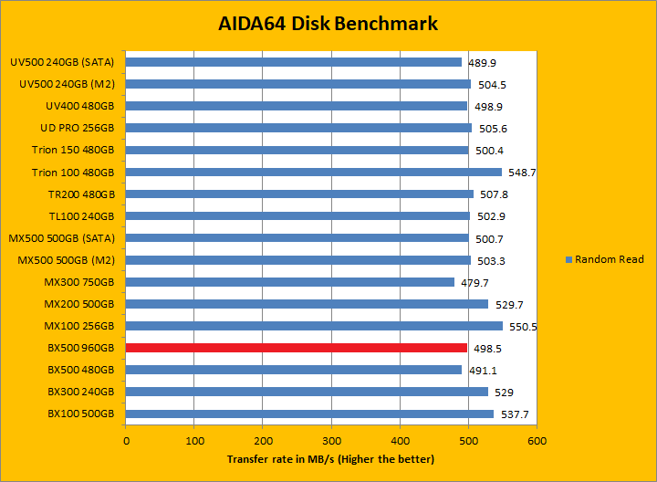 Since our SSD review benchmark results are presented in alphabetical order, first up on the list are results from one of our favorite benchmarking programs, AIDA64 Engineer. Just to note, AIDA64 Engineer is a full synthetic benchmark. Unlike full synthetic motor oil, this usually does not always carry a good connotation. While it is not a representation of real life performance -- such as how fast Photoshop opens -- it does provide valuable insight into performance between different drives and different controllers. As you can see in our graphs above, the Crucial BX500 960GB was comparable against other budget drives in the category like the Kingston UV500, Gigabyte UD PRO, and its predecessor, the BX300. The tested random access time was 0.03ms, which was a step back from its predecessor, but the same as the BX500 480GB. The rest of the comparison results against all the other drives can be seen in our graphs above.