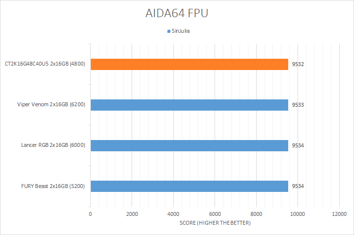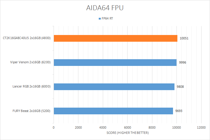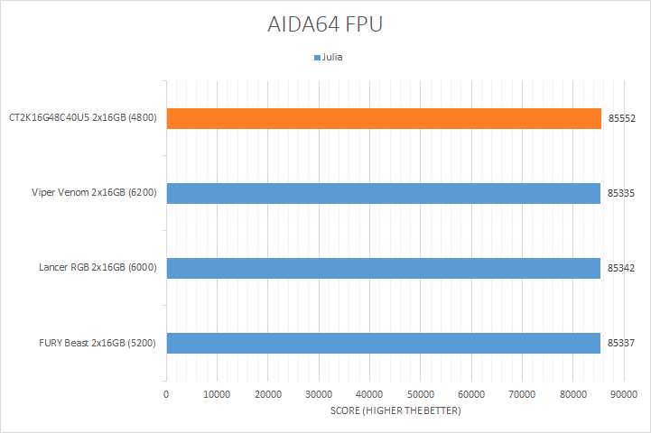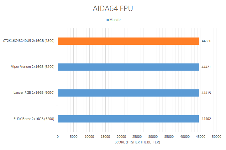 Usually, AIDA64's FPU benchmarks are the least exciting of all when writing a RAM review. This is because the way results are obtained is usually highly dependent on the tested processor; so much to an extent that the outcome is typically irrelevant to the speed or latencies of the installed memory modules. As you can see in our graphs above, all the results were within a hair of each other with the exception of the FP32 RT and FP64 RT tests. In the FP32 RT test, the CT2K16G48C40U5 was 10.7% faster than the Viper Venom RGB. Strangely enough, it seems the slower the RAM, the higher the score. In the FP64 RT test, there was a relatively wider gap compared to the first three results, but the difference was only 3.7% in favor of the CT2K16G48C40U5 compared to the lowest scored FURY Beast. At the end of the day, they were almost all within the same ballpark as each other.