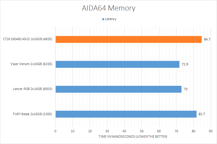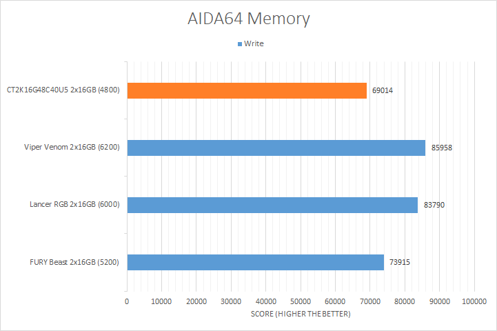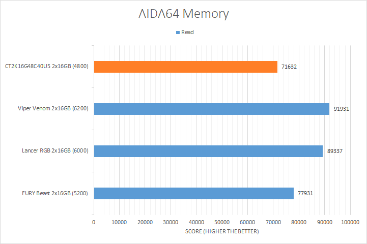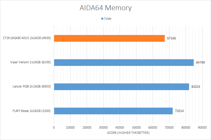 AIDA64's synthetic memory tests are the one next up to produce results for our review today. Traditionally, in pretty much all the benchmarks, see higher memory bandwidth RAM kits are generally favored, whether it is the Copy, Write, or Read results. Operating at DDR5-4800, the Crucial CT2K16G48C40U5 came in last in all tests by a considerable margin, which is not surprising given its rated bandwidth.
