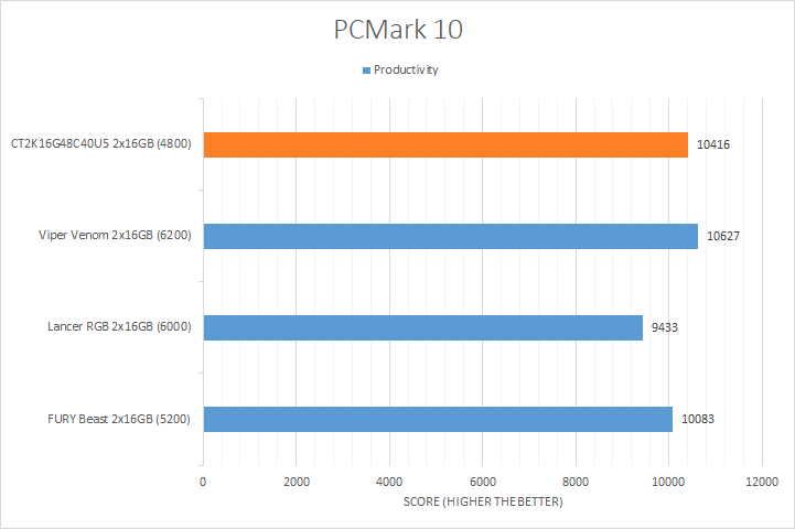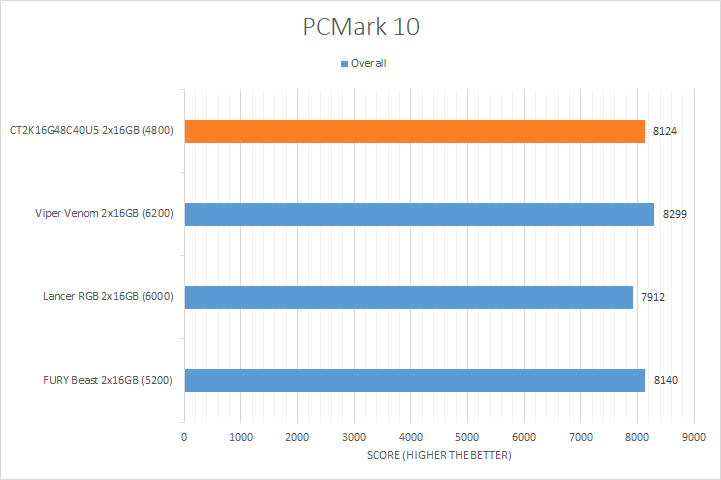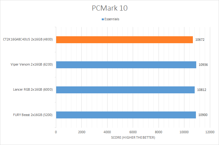 PCMark 10 is the latest version of the popular full system benchmark from UL. A standard benchmark run provides scores in three categories, which includes Essentials, Productivity, and Digital Content Creation. Wrapping up all three categories is an overall score in the end. This is a synthetic test that aims to emulate real-world conditions, which provides interesting insight to the performance of your system. There was some variance in the results of the tested kits, which you can see in our graphs above. The Crucial CT2K16G48C40U5 DDR5-4800 2x16GB scored within the same ballpark as all the other tested memory kits, and even beating at least one of them in two of the four results, demonstrating some solid numbers despite its slower rated speed.