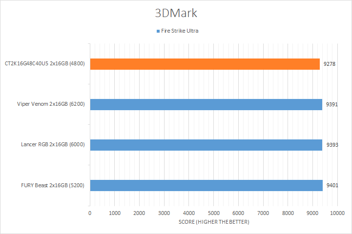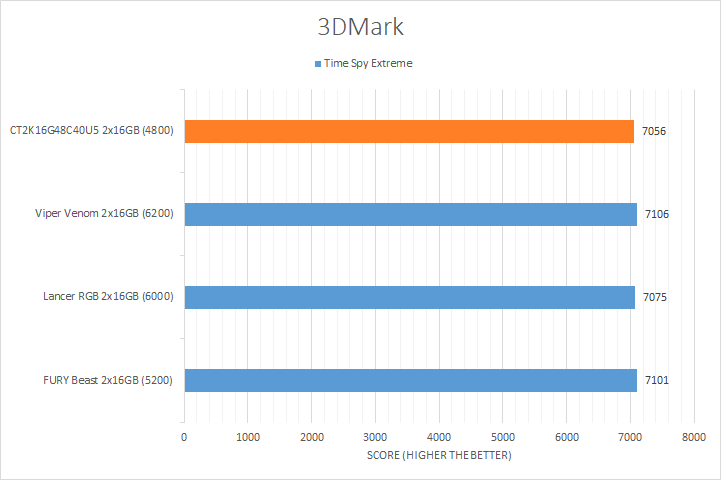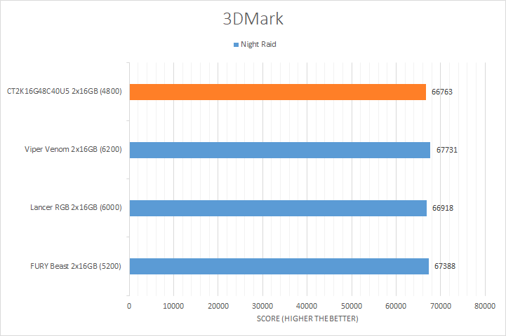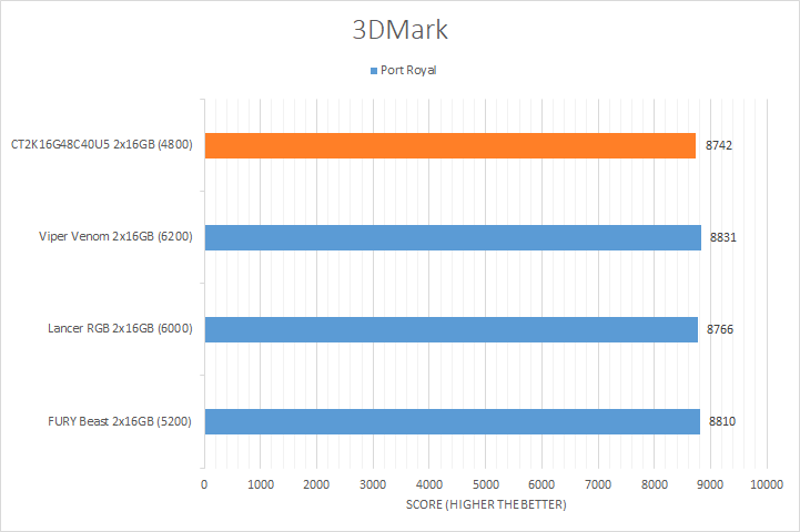 Like UL's PCMark 10 benchmarking suite, 3DMark is yet another favorite among enthusiasts and reviewers alike. In fact, it has been part of the APH Networks' battery of standard benchmarks since the very beginning. The latest iteration of 3DMark is available in a series of presets. We included Port Royal, Time Spy Extreme, Fire Strike Ultra, and Night Raid. Port Royal is for real-time ray tracing, Time Spy Extreme tests 4K gaming with DirectX 12, Fire Strike Ultra tests 4K gaming with DirectX 11, and Night Raid is a DirectX 12 test for PCs with integrated graphics. As you can see in our graphs above, the Crucial CT2K16G48C40U5 DDR5-4800 2x16GB remained within a hair of the competition even if it came in at the back in every test, showing memory bandwidth played a negligible role in 3DMark.