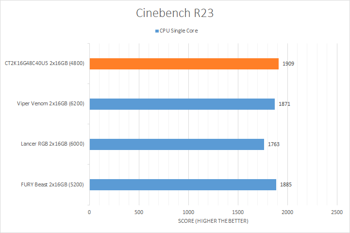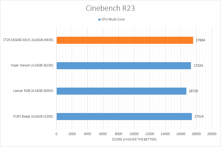 Cinebench R23 is Maxon's latest benchmark to measure CPU rendering performance. Two CPU tests were conducted; one using only one core on my Intel Core i5-12600K, while the other utilizes all available cores. Obviously, having a fast processor will play a significant role in determining these scores, but that does not mean RAM does not do anything at all to contribute to these results. As you can see in our charts above, the Crucial CT2K16G48C40U5 DDR5-4800 2x16GB came in first compared to all the other tested memory modules, which is surprising, considering the CT2K16G48C40U5 has the lowest rated bandwidth. This is notable against the lowest scored DDR5-6000 XPG Lancer RGB, where the Crucial RAM beat it by a rather considerable 8.2% in the single core test and 5.3% in the multi-core test.