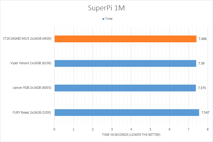 We have always included SuperPi in our benchmark results, because it is a quick and dirty run that always proves to be interesting. It is neither the fastest way to calculate Pi nor is it the most challenging. But being an enthusiast at heart, this program has always provided interesting results for showing off your overclocking prowess on your favorite online outlet. This time around, the Crucial CT2K16G48C40U5 DDR5-4800 2x16GB scored a little bit better than the faster Kingston FURY Beast DDR5-5200 2x16GB, but was slightly behind the even faster Patriot and XPG kits.