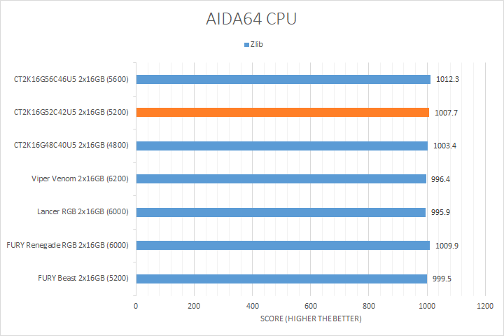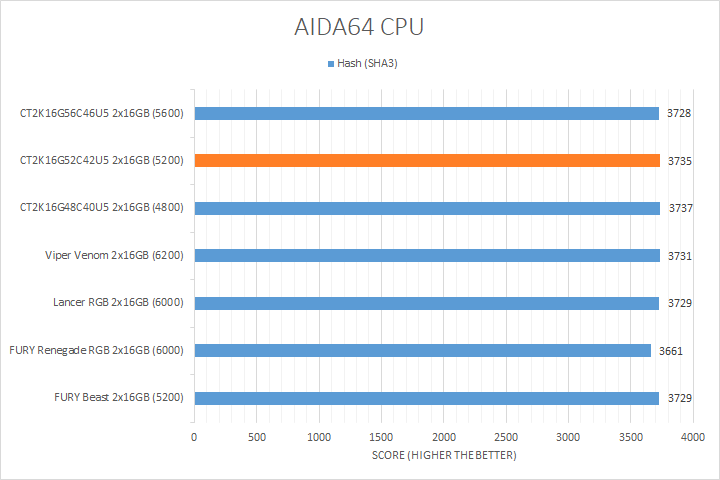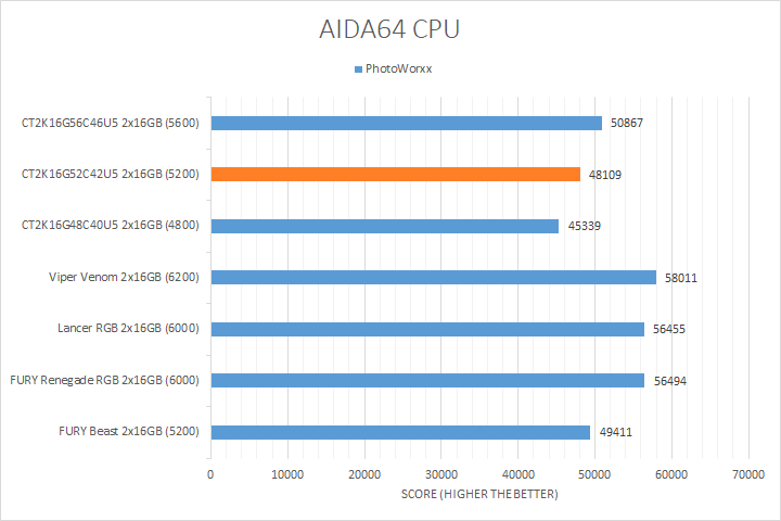 Taking a look at the first set of AIDA64 tests, the CPU benchmarks, you can see for the most part, all of our DDR5 memory kits performed very close to each other. The only test with notable differences was Photoworxx, as the results scaled with the operating transfer speeds of the memory. As such, the Crucial CT2K16G52C42U5 DDR5-5200 2x16GB kit result was smack in between the other two Crucial memory of lower and higher transfer rates. It was also just slightly behind the Kingston FURY Beast set, which operates at the same rates. Otherwise, the rest of the tests showed all of these kits performed relatively equally, with very little difference across the other four sets of results.