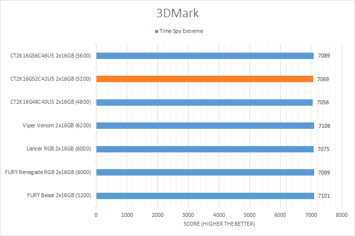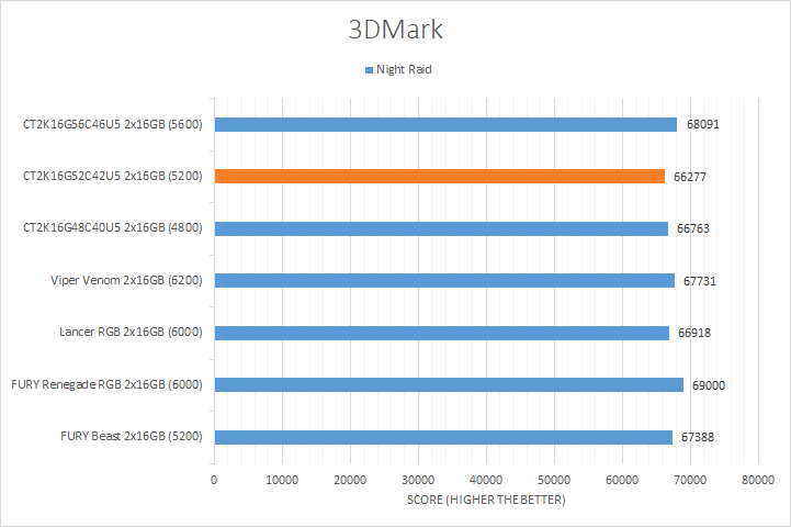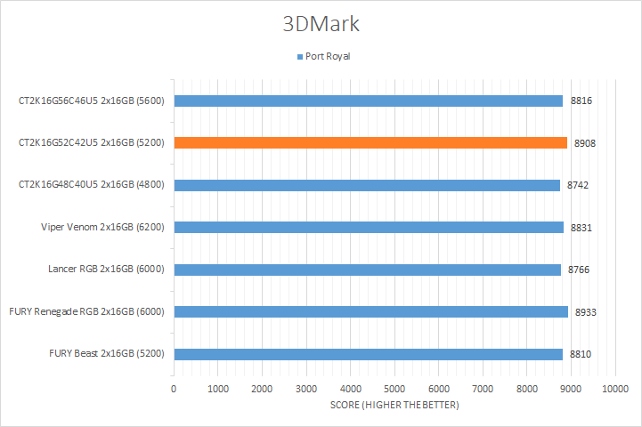 Similar to UL's PCMark 10, 3DMark is another favorite among enthusiasts and reviewers alike. In fact, it has been part of the APH Networks' battery of standard benchmarks since the very beginning. The latest iteration of 3DMark is available in a series of presets. We included Port Royal, Time Spy Extreme, Fire Strike Ultra, and Night Raid. Port Royal is for real-time ray tracing, Time Spy Extreme tests 4K gaming with DirectX 12, Fire Strike Ultra tests 4K gaming with DirectX 11, and Night Raid is a DirectX 12 test for PCs with integrated graphics. From the graphs above, you can see all of our kits were relatively close regardless of the memory bandwidth. The largest margin was found in the Night Raid test with a notable 4% difference from the highest to lowest. Even so, this is not too surprising, as these tests are more dependent on the GPU used in testing and this is reflected by the smaller variations in the results.
