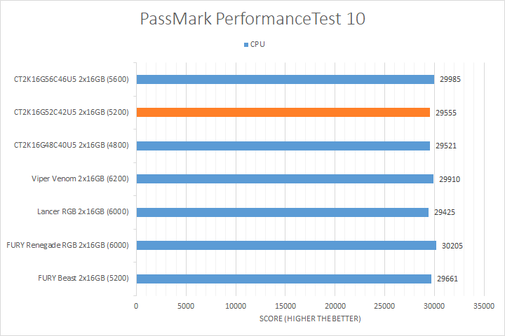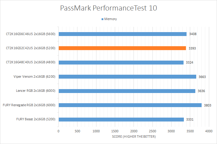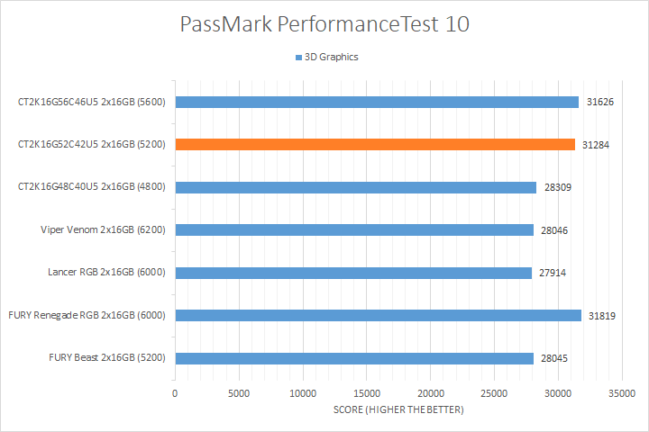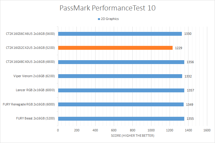 PassMark PerformanceTest 10 is used to evaluate four different areas of our system; coming down to the CPU, RAM, 2D Graphics, and 3D Graphics. It takes a somewhat different approach in obtaining results compared to other programs, which is why we like to use it, haha. PassMark Performance Test 10's memory benchmarking tool is the only test in our setup that takes memory capacity into account, but it does not seem to account for anything above 16GB from our past experience. The memory benchmarks did account for the differences in data transfer rates, as the Crucial CT2K16G52C42U5 was practically as expected, beating out the Crucial CT2K16G48C40U5 and Kingston FURY Beast by expected margins. Otherwise, our Crucial kit today was notably behind the rest in the 2D Graphics test, while also performing much better in our 3D graphics tests, at least compared to other kits. In fact, the 3D Graphics test showed results all over the place and seemed to have little relationship with anything.