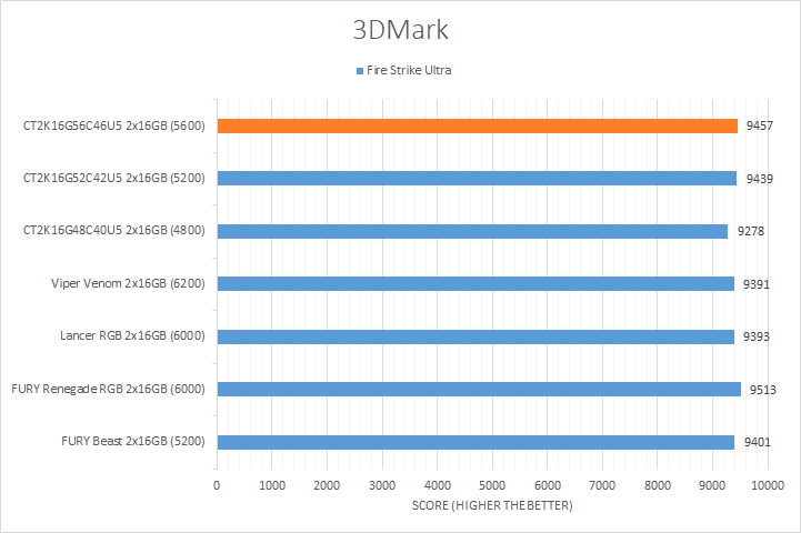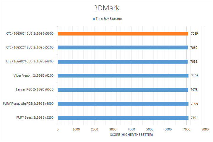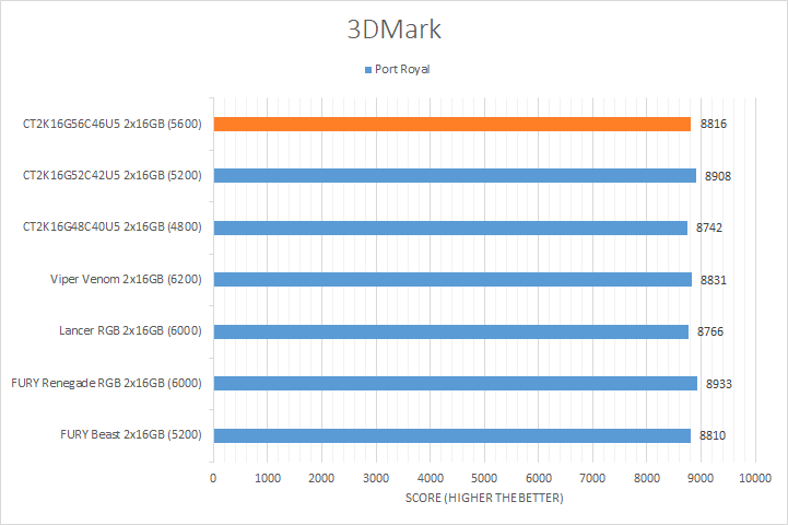 Similar to UL's PCMark 10, 3DMark is another favorite among enthusiasts and reviewers alike. In fact, it has been part of the APH Networks' battery of standard benchmarks since the very beginning. The latest iteration of 3DMark is available in a series of presets. We included Port Royal, Time Spy Extreme, Fire Strike Ultra, and Night Raid. Port Royal is for real-time ray tracing, Time Spy Extreme tests 4K gaming with DirectX 12, Fire Strike Ultra tests 4K gaming with DirectX 11, and Night Raid is a DirectX 12 test for PCs with integrated graphics. From the graphs above, you can see all of our kits were relatively close regardless of the memory bandwidth. The largest margin was found in the Night Raid test with a notable 4% difference from the highest to lowest. Even so, this is not too surprising, as these tests are more dependent on the GPU used in testing and this is reflected by the smaller variations in the results.