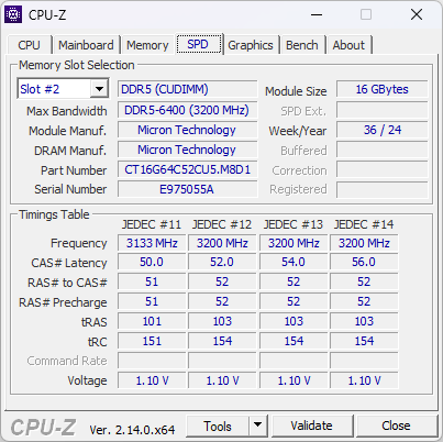 A screenshot of the memory tab in CPU-Z with Crucial's CT2K16G64C52CU5 DDR5-6400 2x16GB installed. The SPD timings table in CPU-Z reads standard JEDEC specifications programmed into the memory. Our ASUS ProArt Z890-Creator WiFi motherboard used for testing had no issues detecting and working with the CT2K16G64C52CU5 RAM right out of the box using the latest BIOS revision. The Crucial CT2K16G64C52CU5 DDR5-6400 2x16GB kit retails for approximately $170 at press time.