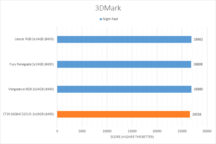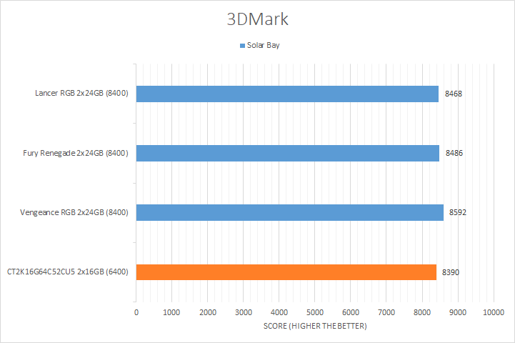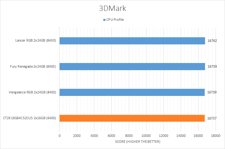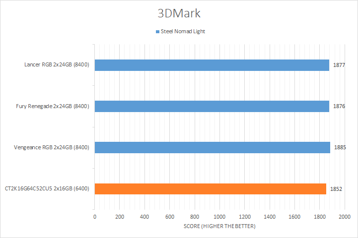 As you can see in our graphs above, the Crucial CT2K16G64C52CU5 DDR5-6400 2x16GB remained close to the Corsair Vengeance RGB DDR5-8400 2x24GB, Kingston Fury Renegade DDR5-8400 2x24GB, and XPG Lancer CUDIMM RGB DDR5-8400 2x24GB, showing memory bandwidth played a relatively minor role in these tests.