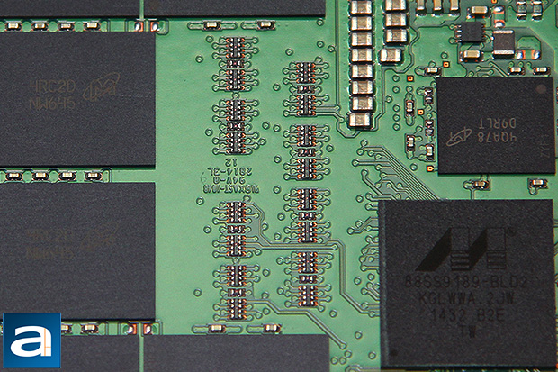 Of course, the part that really stands out about the Crucial MX100 is its low cost flash memory ICs. A total of sixteen NAND flash chips are found on the Crucial MX100 256GB solid state disk, with eight on each side. The chips used are Micron's own MT29F128G08CBCCBH6-10:C (FBGA code NW645) NAND flash memory, with a capacity of 16GB per integrated circuit chip. These are multi-level cells manufactured on the 16nm fabrication process, which are exclusive to Micron at press time. Its rated write endurance is 72TB, which equates to 40GB per day for five years. Unlike SandForce and some Marvell based SSDs, there is no over-provisioning, so they all come together and make up for its 256GB storage capacity. You will see 239GB in Windows. One Micron MT42L256M16D1 (FBGA code D9RLT) 512MB LPDDR2-1067 chip is present; it is used by the Marvell 88SS9189 controller for system memory.