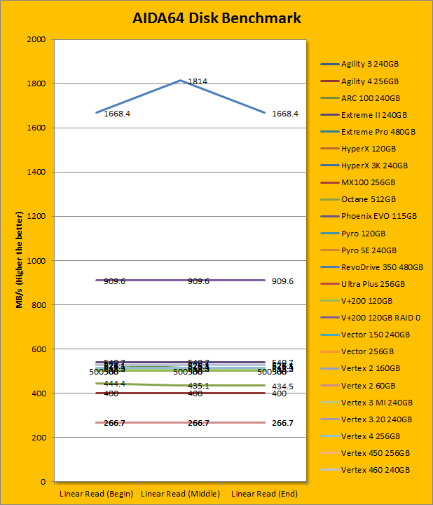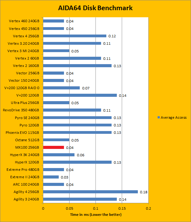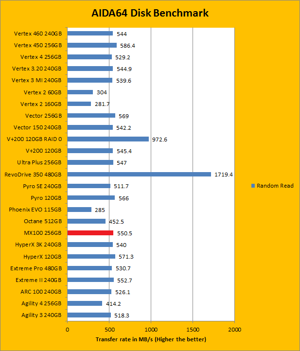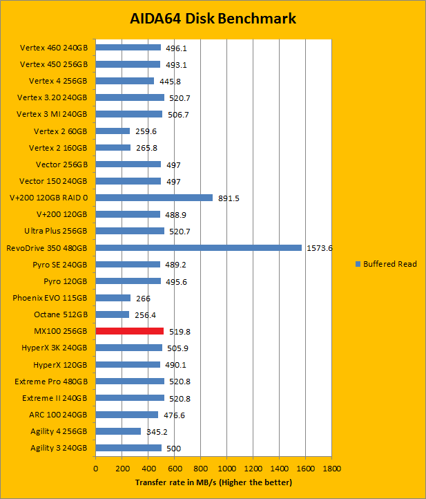 Since our SSD review benchmark results are presented in alphabetical order, first up on the list are results from one of our favorite benchmarking programs, AIDA64 Engineer. Just to note, AIDA64 Engineer is a full synthetic benchmark. Unlike full synthetic motor oil, this usually does not always carry a good connotation. While it is not a representation of real life performance (Such as how fast Photoshop opens), it does provide valuable insight into performance between different drives and different controllers. As you can see in our graphs above, the Crucial MX100 256GB is slightly faster than the OCZ ARC 100 240GB, which are both value oriented solid state drives. With a linear read speed of 526.1MB/s, random read of 550.5MB/s, and buffered read of 519.8MB/s, these numbers are surprisingly good. The tested random access time is 0.04ms, which are extremely competitive figures even among performance drives.