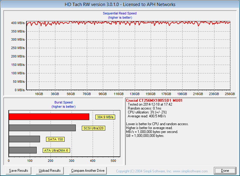 After giving the Crucial MX100 256GB a clean format and ensuring alignment and everything is correct, I fired it up for some testing in HD Tach. While HD Tach is more of a 'drag race' than a clear indication of real life performance, and has been around for a really long time, it is an excellent storage performance reference among SSDs with the same controller, and has been our favorite benchmark long before hard drives even cracked the 50MB/s mark. With an average read speed of 400.5MB/s according to HD Tach in single disk configuration, this is very good. For most solid state drives, we typically look for something that is faster than 350MB/s. From our experience, most drives do not crack the 400MB/s line. At the end of the day, HD Tach may not be the best test for solid state drives all the time, but 400MB/s is 400MB/s.