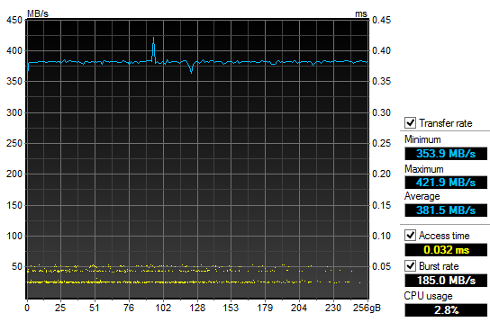 Unfortunately, HD Tune does not generate any fancy independent graph outputs in particular, so I had to edit my screenshot out a bit to make it look better for publishing in a review. Again, like our HD Tach results on the previous page, the line is nice and flat as before. It differs slightly in magnitude than the other program -- probably due to testing algorithms used -- but its performance characteristics are identical in practice. Other than that, the results are commendable across the range; the recorded access time is very low, as we would expect from a solid state drive. The Crucial MX100 256GB posted roughly similar results otherwise for the sequential read speed. Do keep in mind the discussion we had on the previous page, as it still applies here.