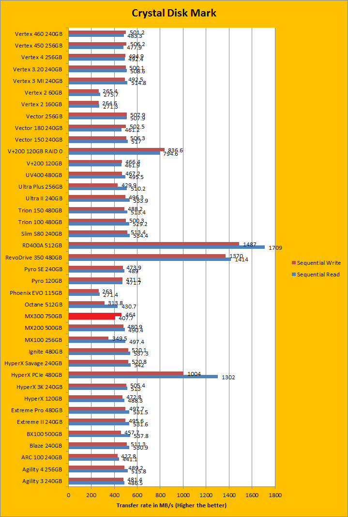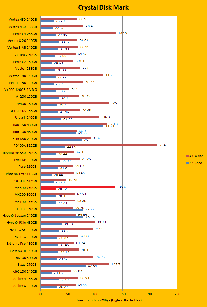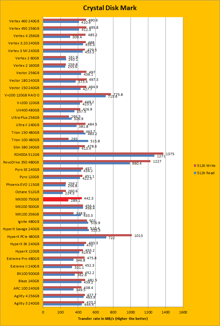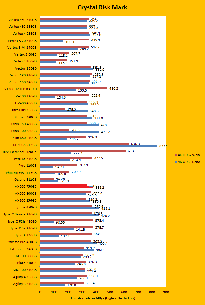 Crystal Disk Mark 3.0 is in the spotlight. Just a bit of background information; higher capacity drives traditionally tend to perform a little better in these tests. The ability of a controller and flash memory to deliver high IOPS will provide huge benefits to the score as well. As you can see in our charts above, compared against a few select drives, namely, the Crucial MX200 500GB, OCZ Trion 150 480GB, and Kingston SSDNow UV400 480GB, the Crucial MX300 750GB came up last or close to last in half the results, although it was always very close behind even if it was last. In the Read category, it was slower than its predecessor in the sequential tests. However, it tied the MX200 in the 4K test, and even managed to exceed it in the 4K QD32 results. In the Write category, again, we can see a similar pattern, except it totally destroyed the MX200 in the 4K test to be in the same category with the other SSDs of interest. Overall, the mainstream MX300 750GB delivered performance quite in line with the competition, even though it occasionally came up a little bit short. I will let you check out our massive comparison graphs above.